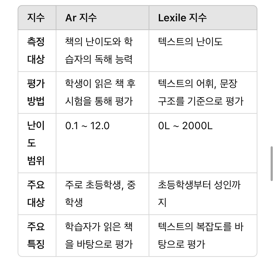 영어 학습에서 Ar 지수와 Lexile 지수는 학생들의 독해 능력과 수준을 측정하기 위한 도구로 널리 사용됩니다. 이 두 지수는 각기 다른 방법으로 학습자의 독해 능력과 텍스트 난이도를 평가하지만, 궁극적으로 학생들이 적절한 수준의 텍스트를 선택하여 효율적인 학습을 할 수 있도록 돕습니다. 본 글에서는 두 지수의 차이점과 특징을 비교하고, 이를 바탕으로 연령별 영어 학습법과 추천 도서를 제시하겠습니다.1. Ar 지수 (Accelerated Reader, AR)Ar 지수는 주로 초등학교 및 중학생을 대상으로 한 독서 프로그램으로, 학생이 읽은 책의 난이도를 평가하는 지표입니다. 이 시스템은 텍스트의 길이, 문법, 어휘 등을 바탕으로 책의 난이도를 점수로 표시하며, 학생이 읽고 이해한 내용을 바탕으로 시험을..